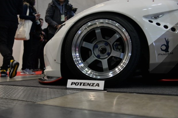 该车具有夸大的扁平前唇,无穷的后扰流板,Rocket Bunny宽体套件选用螺丝钉穿孔方式固定,轮胎装备的是普利司通的搏天族系列。