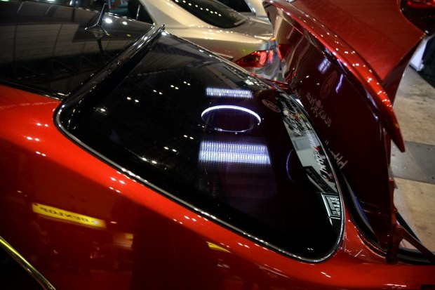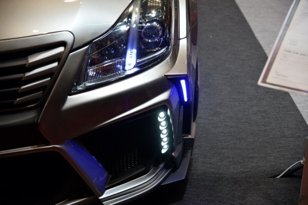 首要看到的第一款最夺目的即是一套宽体车身套件,广大的进气口几乎占据了车头大多数面积,边际的成排的大颗LED光源和深色的前唇衬底,活脱脱一艘太空船。啥?神似GT-R?恶作剧的事儿别当真。