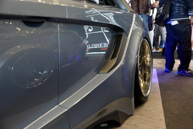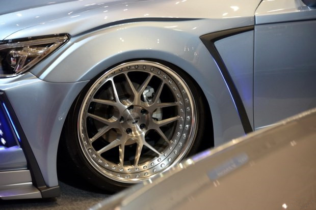 从侧面观看,宽体车身套件将“太空船”外观进行到底,和前后杠、侧裙连接成一体的轮眉带有各种装饰性的通风口,在空气悬架的协助下深深下降,终究让你把视线定格在Hyper Forged出品的HF07铸造轮圈上。