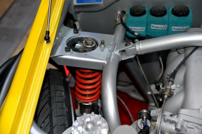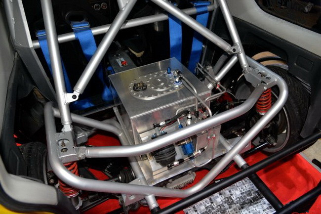 翻开发动机舱盖,车头加厚的中冷器和水箱昭示着其非凡的功能,防火墙方位并排的是三个储液壶昭示着它前后独立的赛车化制动体系构造。车辆后部的赛用油箱优化了前后配重,油箱下面则是带有独立散热体系的传动后桥,为400马力的输出铺平道路。所以从某种意义上来说,它更是一辆管阵式构造的Silvia,披着吉姆尼的皮算了。