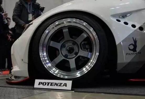 GReddy的这台改装车拥有夸张的扁平前唇和巨大的后扰流板,并配备了普利司通的搏天族系列轮胎。