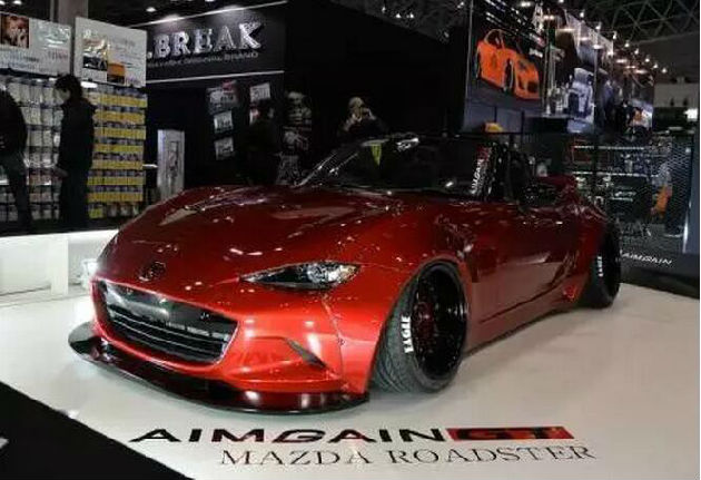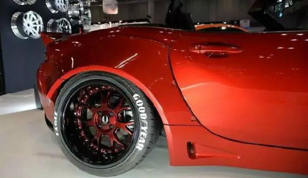 GReddy的MX-5的车身以白色为主,AIMGAIN改装的MX-5则是红色车身,这辆红色MX-5同样采用了宽体套件,整体风格却不同于GReddy的MX-5,感觉更加稳重。此外,这台MX-5采用的是固特异Eagle系列轮胎,视觉效果不错。