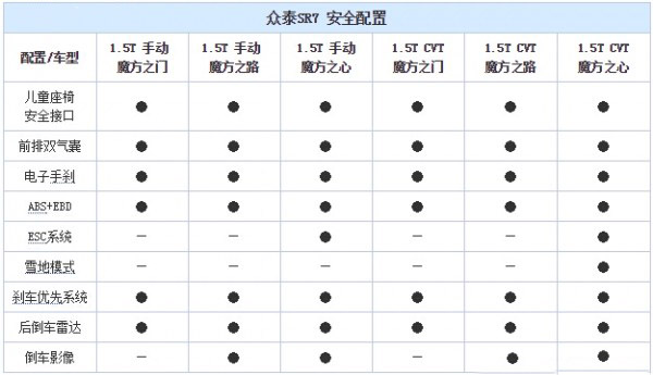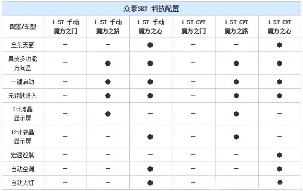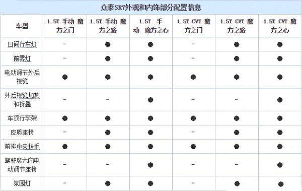 众泰SR7车型配置曝光 共6款车型