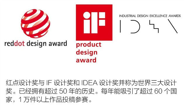 红点奖(Red Dot):是高品质设计的象征。评委会将这一设计师梦寐以求的品质认证授予那些凭借非凡的设计而从同类中脱颖而出的产品;