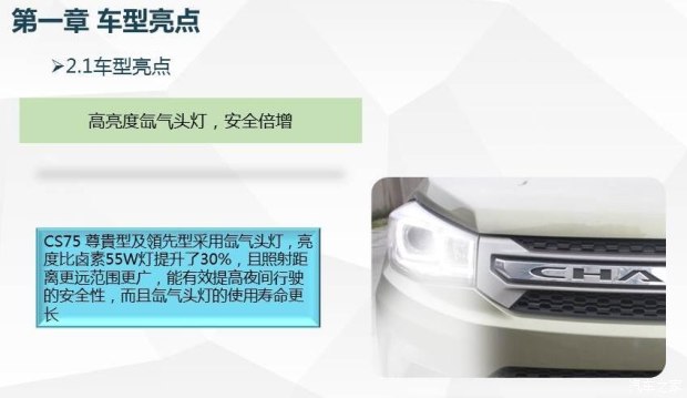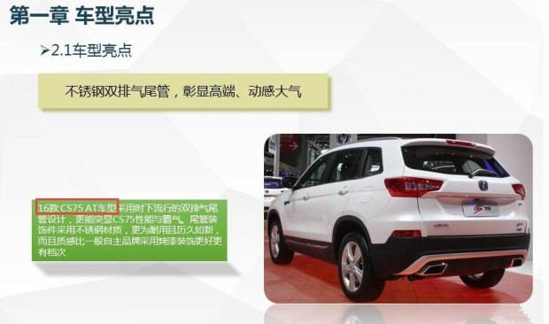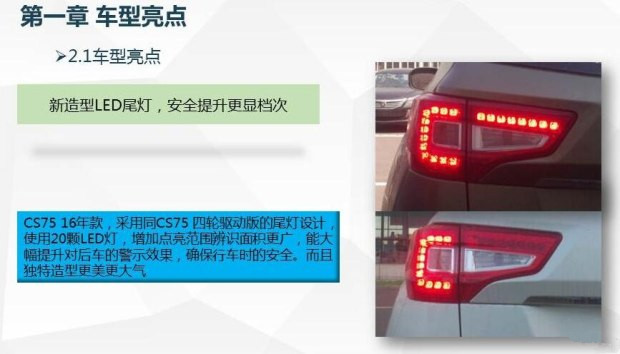 首先在外观方面,2016款CS75将会对细节进行了一些改进,例如前大灯使用了与1.8T四驱车型相同的天使眼LED日间行车灯,同时部分车型还会配备氙气大灯。尾部方面,新款车型采用了带有LED光源的新灯组,此外自动挡车型尾部还会配备双边共两出的镀铬排气管装饰。