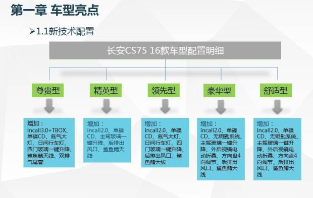 从上图来看,2016款CS75细分车型的配置均有不同程度的升级,例如现款舒适型增配了无钥匙进入、电动折叠外后视镜等实用性较高的配置。但关于新款车型动力方面等信息,官方暂未透露,我们也将继续关注。
