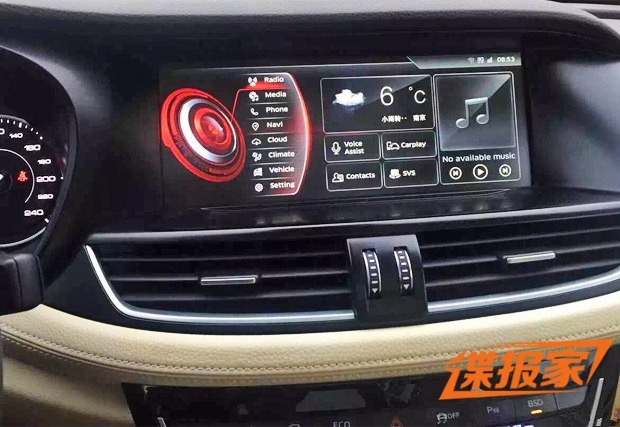 内饰方面,新车中控台采用了上深下浅的双色处理,并运用了浅色皮质包裹辅以缝线处理。同时,该车中控台中央装配有大尺寸彩色显示屏,从其显示界面来看,其操作系统并未进行汉化,而在功能方面则配备有蓝牙电话、导航、语音控制、苹果CarPlay、天气显示以及WiFi功能等。