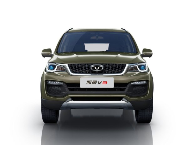 外观部分,凯翼V3运用家族式前脸设计,整体样式与凯翼X3相似,四边形格栅中央镶嵌有凯翼品牌标识,两侧内置LED日间行车灯的前大灯与中网格栅相匹配。另外,新车前保险杠底部、轮眉、侧裙等部位均带有跨界车装饰套件。