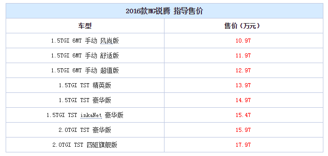 2016款MG锐腾正式上市 售价10.97~17.97万