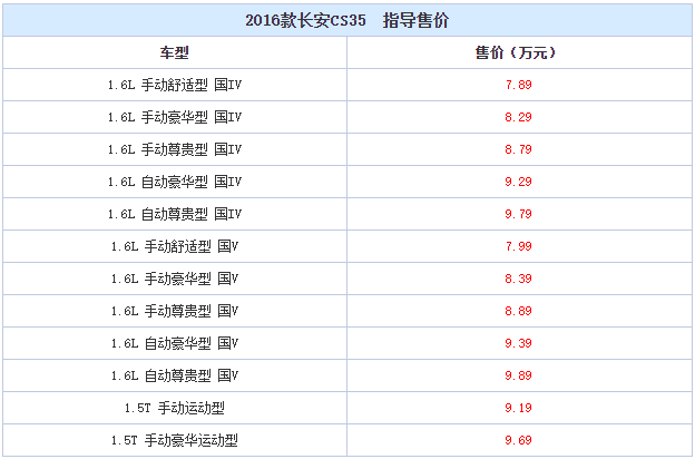 日前,我们从长安汽车官方得到消息,2016款长安CS35正式上市,新车在增加配置的同时,推出了两款1.5T车型,这也使得目前全系可选车型增加到了12种,最低售价仅7.89万元,详细售价请见下表: