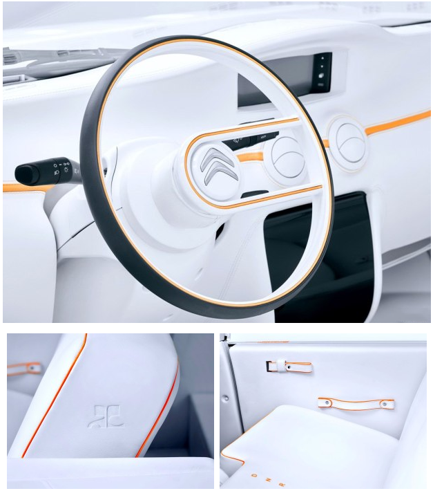从官图来看,雪铁龙E-MEHARI概念车外观及内饰均采用了白色为主色调,局部点缀有橘黄色元素。同时,这款车内部为四座式设计,并拥有敞篷式车身结构,其A柱与B柱之间的车顶由Courreges设计,采用树脂材质打造。