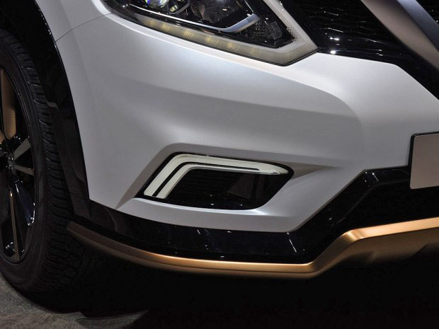 奇骏Premium概念车外观采用了哑光白色车身涂装,其发动机舱盖及车顶运用了碳纤维质感的饰板,并配备了古铜色的前保险杠下护板以及侧裙,四轮轮眉为高光的黑色处理。新车采用了20英寸的双色轮圈,气质独特。另外,新车采用双边共两出式排气系统。