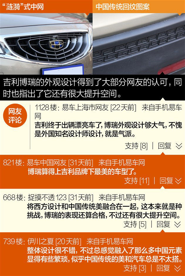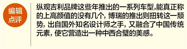 博瑞作为吉利品牌推出的全新旗舰车型,其整体外观沿用了此前发布的KC概念车的设计,同时多处细节都体现了中国传统元素,特别是“涟漪式”进气格栅造型代表了吉利未来车型的设计方向。