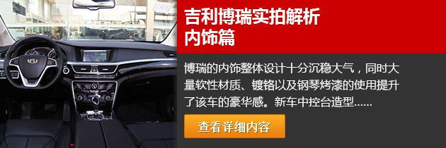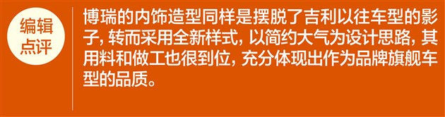 博瑞的内饰整体设计十分沉稳大气,同时大量软性材质、镀铬以及钢琴烤漆的使用提升了该车的豪华感。新车中控台造型层次感分明,挡把控制区按键丰富。