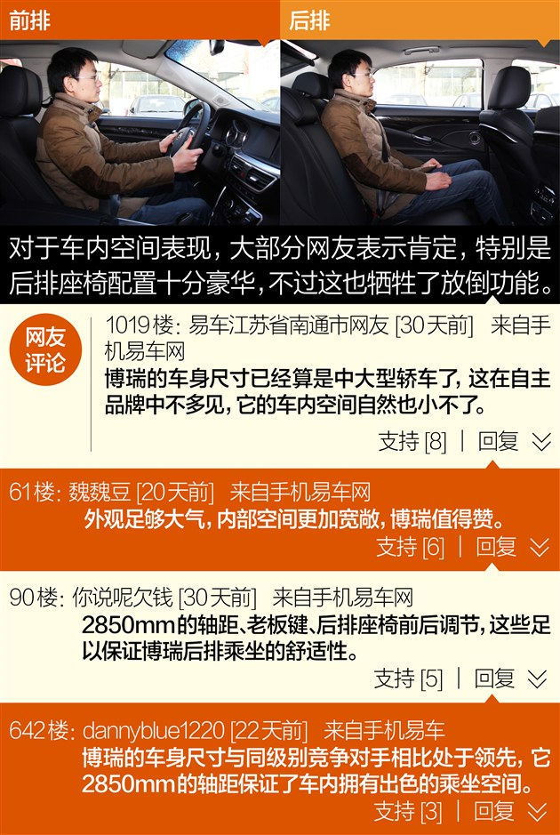 博瑞2850mm的轴距在同级别竞争车型中处于领先地位,其内部乘坐空间良好,同时储物格的设置和内部空间都不错。另外受后排座椅配置的影响,并不支持按比例放倒,好在博瑞的后备厢深度、宽度、平整度很可观。