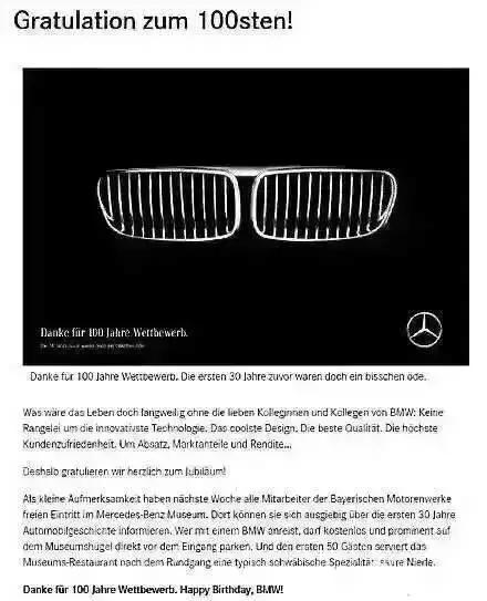 貌似是挑衅,实则也是一份来自对手的敬意,不过在此也有炫耀奔驰历史比宝马悠久的嫌疑。