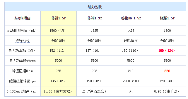 通过对比我们可以看出,这台1.5T发动机相较于自家的1.3T发动机在数据方面还是有一定的提升,并且全面超越了哈弗H6 1.5T发动机的动力输出值,但与锐腾1.5T发动机相比还有差距。