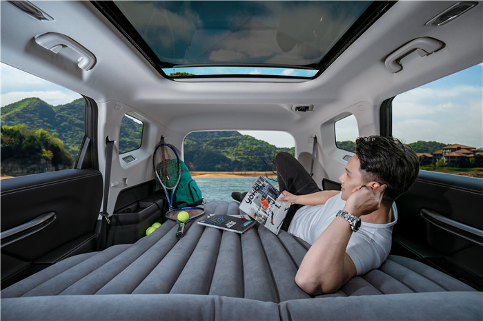 进入车内,豪越的空间相当给力,其中7座版本提供了2+3+2座椅布局,其中后排座椅可以完全放平,放平之后的后备箱就是一张移动的大床。
