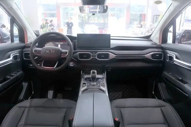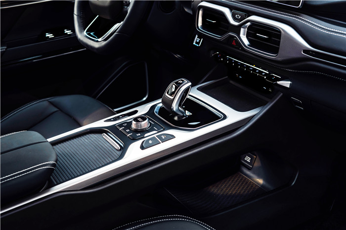在内饰上,豪越并没有采用非常硬派的造型,却与吉利icon风格很接近的设计,整体看起来非常时尚。其中,新车配有三幅平底方向盘,并采用了液晶仪表盘,中控屏尺寸预计超过10英寸。同时,贯穿式设计中控台与"∞"造型的空调出风口相互呼应,使得豪越的座舱内部更宽敞。而空调出风口下方是一组类似钢琴键的实体操作端,和尺寸不小的无线充电接触板,电子挡把造型小巧精致,后方配有驾驶模式切换旋钮。