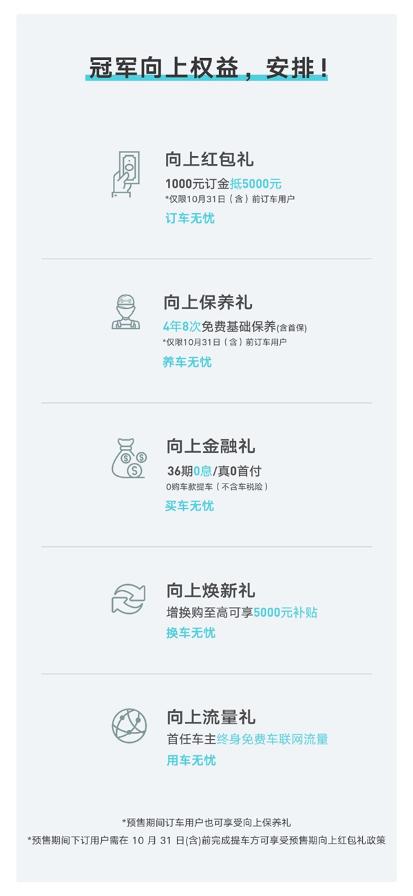 与此同时,吉利官方也推出五大无忧购车福利:1、向上红包礼,10月31日前订车的用户可享受交1000元订金抵5000元的福利;2、向上保养礼,10月31日前订车的用户可享受4年8次免费基础保养,预售期订车用户也可同步享受;3、向上金融礼:购车即享36期0息,更有真0首付,用户不用出一分钱购车款即可提车;4、向上焕新礼:增换购至高可享5000元补贴;5、向上流量礼:首任车主可享终身免费车联网流量。