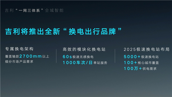 同时,吉利在“换电架构、换电站、换电车辆”领域已经拥有上千项技术专利,并参与了国家换电标准的制定。基于专属换电架构,吉利还将推出全新“换电出行品牌”。到2025年,实现100个核心城市布局5000座极速换电站,满足100万辆车的换电需求。
