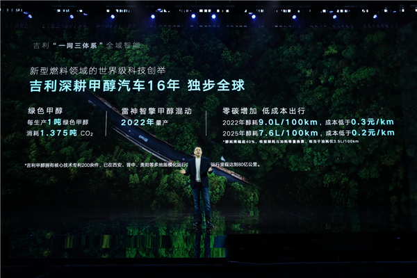 值得一提的是,吉利在新型燃料领域深耕甲醇汽车16年,已经在甲醇能源领域独步全球,拥有核心技术专利200余件,在西安、晋中、贵阳等多地规模化运行2.7万辆,总运行里程达到80亿公里。2022年,吉利将推出“雷神智擎甲醇混动“车型,百公里醇耗在9L左右,醇耗降幅超40%,每公里的出行成本低于三毛钱。到2025年,百公里醇耗将降到7.6L,相当于百公里油耗3.5L,每公里的出行成本两毛钱,生命周期内零碳增加,更环保。