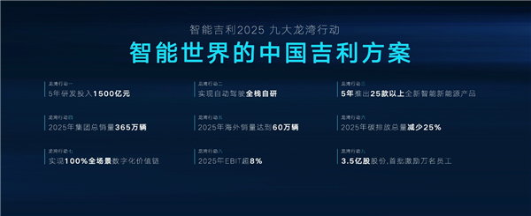 为加速吉利“一网三体系”的成果持续落地, 吉利公布了吉利汽车集团“九大龙湾行动”,保障“智能吉利2025”战略全面落地实施。