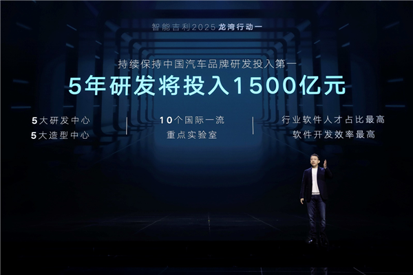 龙湾行动一:吉利将持续保持中国汽车品牌研发投入第一,5年内研发将投入1500亿元。依托吉利全球“5大研发+5大造型中心”构建全球领先的国际化研发体系,全面向智能时代转型,到2025年,实现行业软件人才占比最高,软件开发效率最高。深耕基础科学领域研究,打造10个国际一流的重点实验室,加速科技成果转化落地,持续保持吉利核心技术领先。