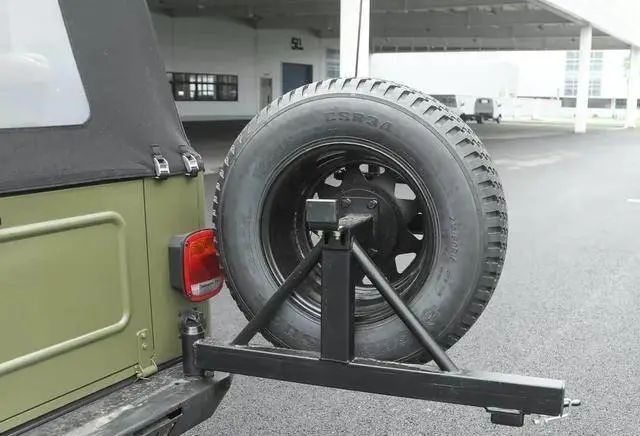 来到新车的尾部,从后面看就是一个方盒子,背着一个全尺寸轮胎,备胎架上还配备了工兵铲和旗杆,出去野的时候为你的安全保驾护航。黑色粗壮的后保险杠,呈现很强的力量感。