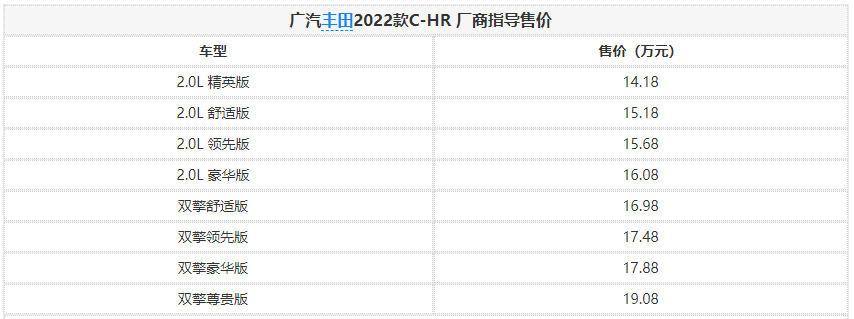 日前,广汽丰田2022款C-HR正式上市,售价区间为14.18-19.08万元,与老款车型相比,2022款C-HR新增一款领先版配置车型。