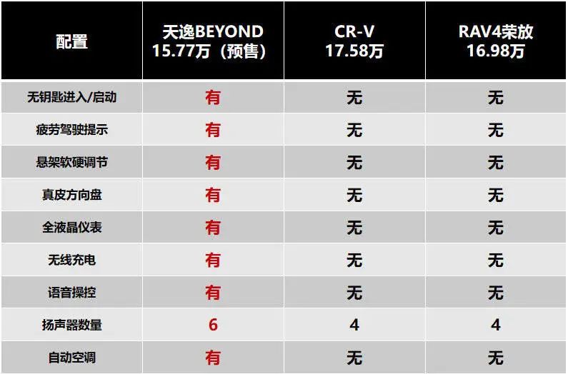 此外,在价格比CR-V、RAV4荣放低的基础上,它还标配无线充电、疲劳驾驶提示、无钥匙进入/启动、语音操控、自动空调、自适应悬架等,完全达到了后者中高配水准。