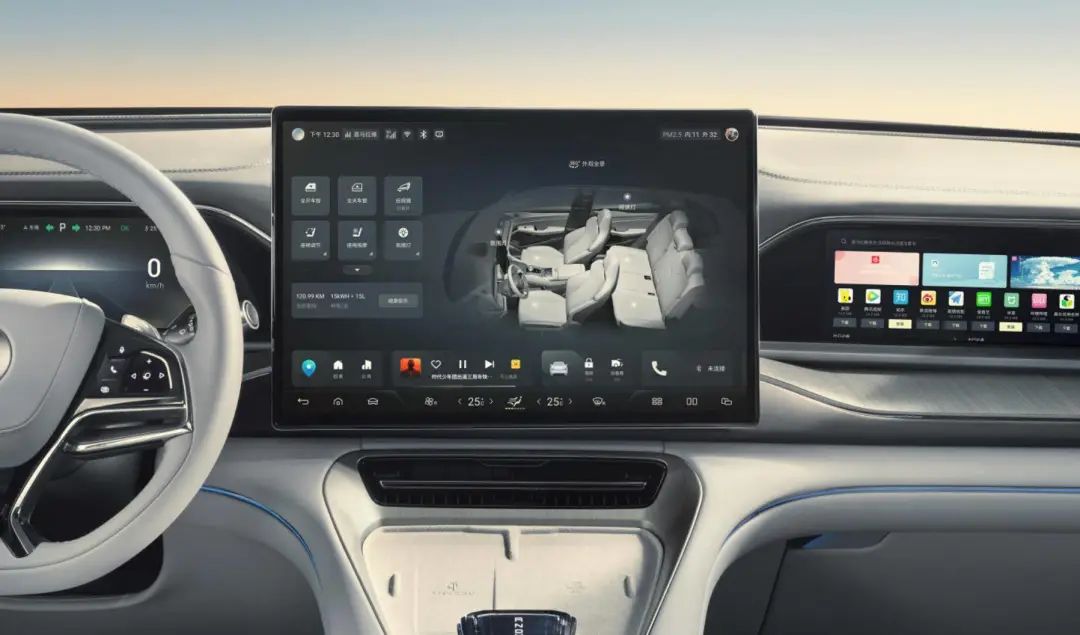 车辆的内饰也极具科技气息,车内采用采用“无限探索”的设计语言,中控台一共配备6块显示屏,分别是大尺寸悬浮式中控屏、副驾前方的内嵌式的副驾娱乐屏、AR-HUD抬头显示、仪表屏、双侧智能风口显示屏。