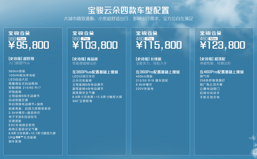 2023年8月10日,“舒适大五座纯电家用车”宝骏云朵全国正式上市。此次宝骏云朵共上市四款配置,360 Plus售价为9.58万、360 Pro售价为10.38万、460 Pro售价为11.58万、460 Max售价为12.38万,正式将中国纯电A级车的价格拉到10万元以内,给了消费者更多纯电车型选择以及降低了入门门槛。