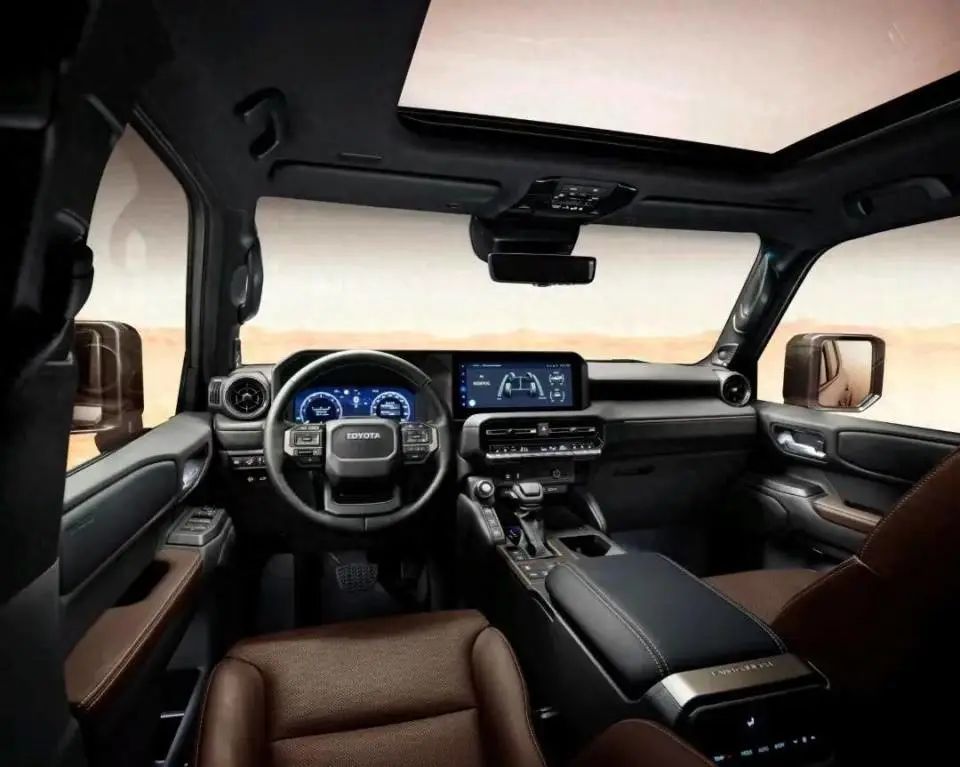 在整个内饰方面,全新普拉多采用对称式布局,虽然说科技感没有主流车水准,但是质感还是不错的,新车的中控配备的全新造型的多功能方向盘、圆形空调出风口、全液晶仪表盘和悬浮式中控屏。