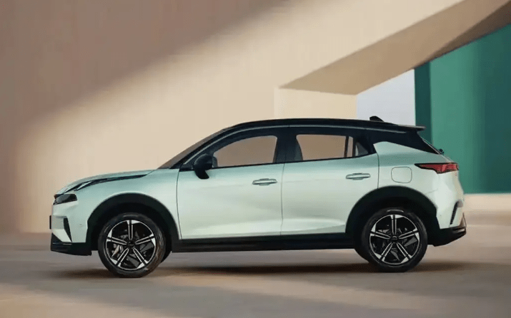 车身尺寸方面,新车的长/宽/高分别为4350*1820*1625mm,轴距为2640mm,依旧定位小型SUV。领克06EM-P的侧面设计非常运动,浅绿色与黑色搭配的车身颜色设计大胆前卫,悬浮式车顶的视觉效果灵动,反光镜做了黑化处理,配备了机械式门把手,增强了可靠性,此外还选用了五辐式黑化处理的18寸的铝合金轮毂,进一步提升运动属性。