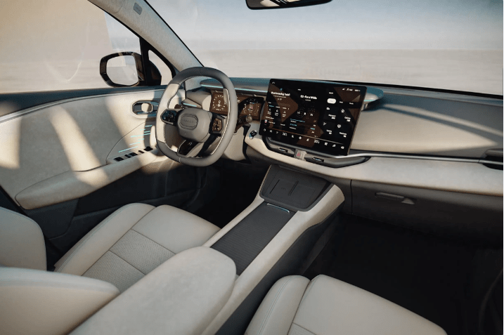 新车内部采用了当前非常主流的设计语言进行打造,几乎所有功能都被集成在了尺寸宽大的中控屏内,中控台上没有看到传统物理按键的身影。此外,新车所配备的多功能方向盘样式与领克08保持高度一致。此外,新车与领克08相同,同样采用怀挡设计。我们还可以看到,新车中控台处配有贯穿式的蓝色饰条,营造出了更加年轻化的座舱氛围。