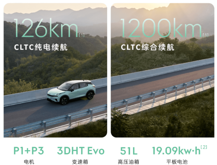 动力方面,领克06EM-P搭载由1.5L高效发动机与P1+P3双电机组成的超级增程方案,这套系统的最大功率达到了220kW,峰值扭矩568Nm,传动系统匹配3挡DHT变速箱,采用P1+P3双电机布局,CLTC综合纯电续航里程可达126km,最大续航里程可达1200km,有效解决了令人焦虑的续航里程。