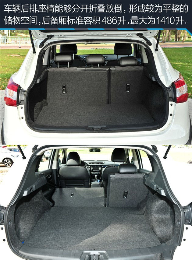 与之前相比,日产全新逍客车长、轴距、车宽尺寸都增加了。储物空间方面,全新逍客前后车门、前后中央扶手处、中控台下方都设计有储物空间,日常使用方便顺手,保持了日系车一贯人性化的特点。后备厢容积352升增加到了486升,这点对于家用来说很实用。车子后排座椅能够分开折叠放倒,进一步提升后备厢储物空间。