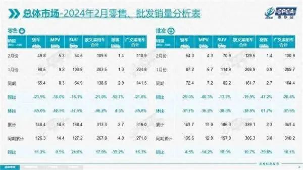 根据乘联会发布的最新数据显示,2024年2月乘用车市场零售109.5万辆,同比下降21.0%,环比下降46.2%;今年累计零售313.3万辆,同比增长17.0%。