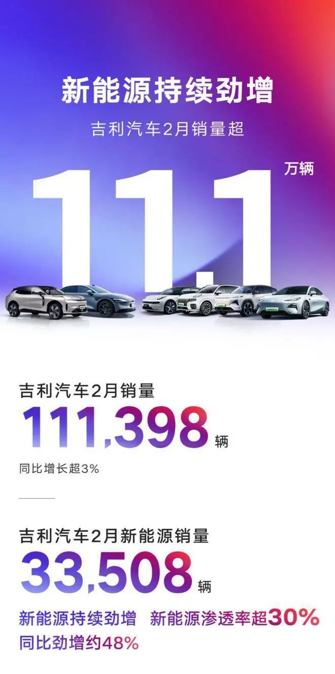吉利汽车在2月共销售了111,398辆新车,同比增长超3%。其中新能源汽车共销售33,508辆新车,同比增长48%,新能源渗透率超30%。同时,吉利汽车1-2月累计销量为324,885辆。