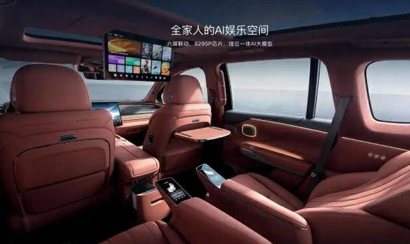内饰方面,游艇环抱式座舱搭配赤壁丹霞、冰岛黑沙、大漠沙棕三种主题,营造出豪华舒适的驾乘环境。车内配置包括真皮方向盘、怀挡式换挡机构、17.3英寸悬浮式中控屏以及27英寸全景HUD抬头显示系统。座椅提供5座和6座布局,且均配备加热/通风/按摩功能。