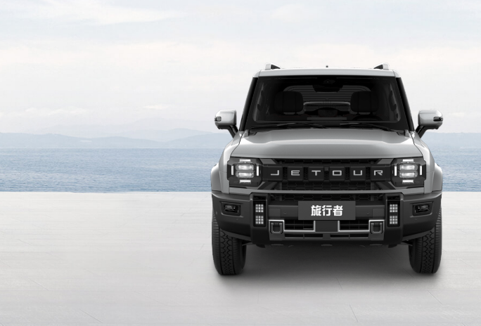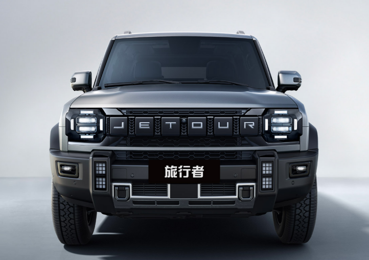 新车延续标志性“方盒子”造型,前脸采用更立体宽大的格栅,中央镶嵌醒目“JETOUR”字母标识,搭配延伸至轮拱的黑色护板,兼具防护性与视觉冲击力。车身侧面线条平直刚毅,营造出“移动堡垒”般的硬朗姿态,并新增深海蓝车色,沉稳中透出力量感。