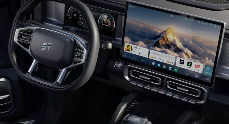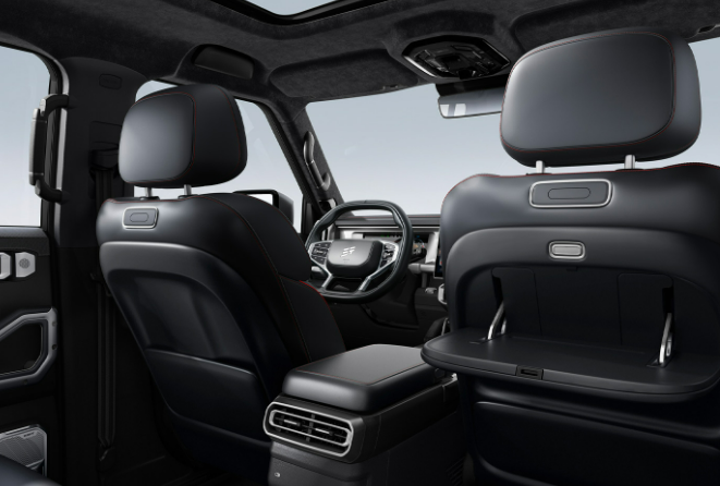 座舱采用T型平直布局,大量物理按键确保越野颠簸中操作可靠。车内设9处力量型拉手,方便乘员抓握;高配车型搭载华为乾崑ADS 4.0智驾系统,支持城区领航辅助、循迹倒车、自动泊车等高阶功能,让硬派SUV也能拥有智能体验。