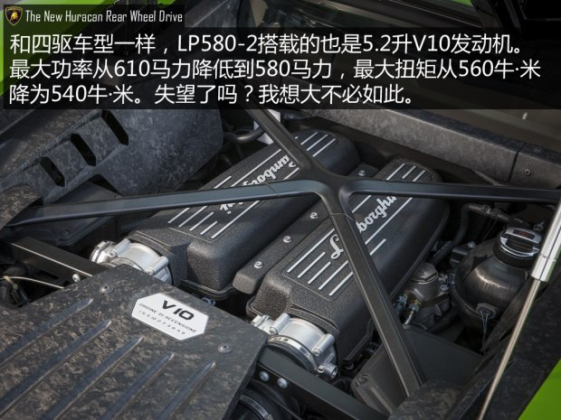 Huracan LP580-2于2015年11月的洛杉矶车展首发,这款车相比在售车型在动力上有两大特点。其一是其继续搭载5.2L V10自然吸气发动机,不过经过全新调校,新车的最大功率为580马力,相比在售的LP600-4限量版以及LP610-4功率要低,同时这款车还是采用的后驱,有别于“-4”车型的四驱。