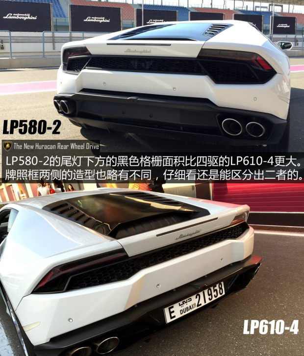 外观方面,作为全新的入门级车型,Huracan LP580-2在外观方面有别于Huracan LP610-4。其中前保险杠造型弱化了兰博基尼家族式的锋利线条,两侧进气开口看起来减少了些许攻击性。车尾部分,新车尾部造型变化并不大,依然保持了兰博基尼家族式的犀利设计,并采用双边共四出的霸气排气,使新车看起来依旧气势十足。