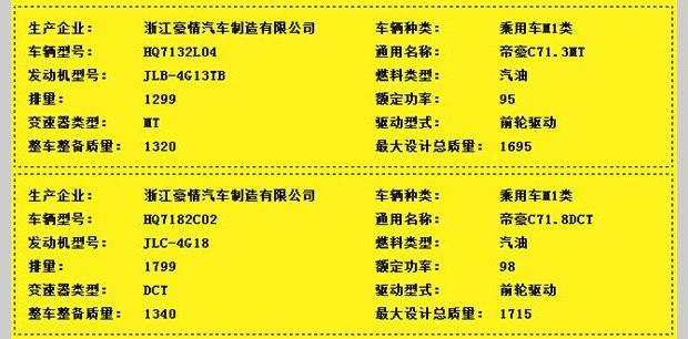 新车的长宽高依次为4720/1802/1478mm,轴距为2680mm,除了车身高度之外,其他尺寸相比帝豪都有所增加,比如轴距就增加了30mm。在动力部分,这款车将会搭载1.3T和1.8L两种排量的发动机,其最大功率分别为129马力和133马力。而在传动系统方面,新车预计会使用DCT变速箱和6速手动变速箱。