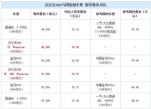 从入门级别车型的海外售价来看,海外版全新S90 T5 Momentum的价格要比相同级别的宝马528i低3,250美元(约合人民币2.1万元),但比功率稍高的奥迪A6 2.0TFSI贵了750美元(约合人民币0.49万元)。