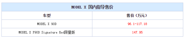 天翼汽车:日前,从相关讯息获知,特斯拉MODEL X将于4月23日正式国内亮相,标准版90D的官方价格区间为96.1-117.18万元,限量版车型的售价为147.95万元。