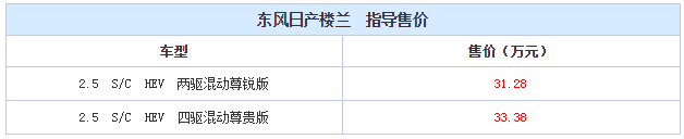 天翼汽车车讯 日前,东风日产宣布楼兰新增两款混动车型正式上市,其售价区间为31.28-33.38万元。详细售价请见下表: