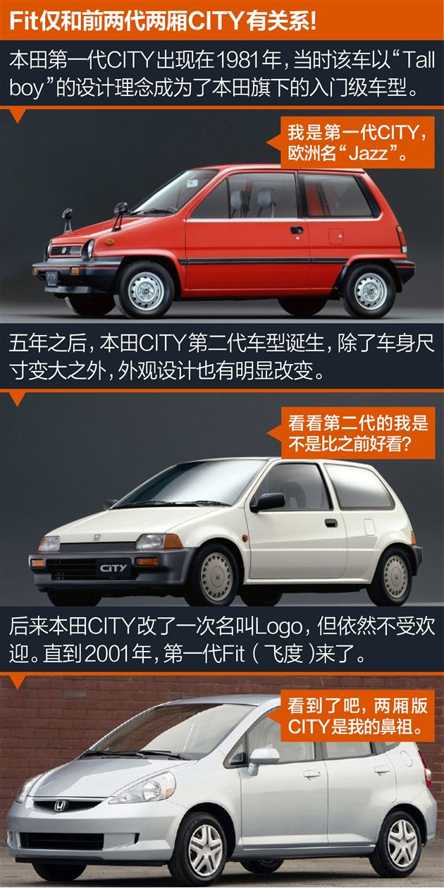 早在1981年,本田就推出过名为CITY的入门级车型,但那时的CITY是一款两厢车,它在海外市场被称为本田Jazz。1986年,第二代两厢CITY诞生,由于惨淡的销量和令人失望的市场表现,这款车在1994年被迫停产,从此本田CITY也就从江湖上销声匿迹了。转到1996年,本田用全新的Logo车型填补了CITY的空白,但没有想到的是销量依然不如人意,直到2001年,“救世主”第一代飞度诞生了。所以说,飞度仅和两厢版的CITY有关系。